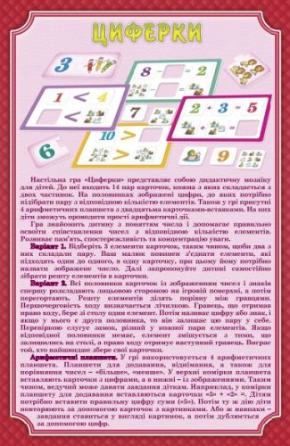 Логічна мозаїка “Циферки”. Настільна гра представляє собою дидактичну мозаїку для дітей. У неї входять 14 пар карток, кожна з яких складається 2-х частин. На половинах зображені цифри, до яких потрібно підібрати пару з відповідною кількістю елементів. У грі присутні 4 арифметичних планшета з 20 картками-вставками.