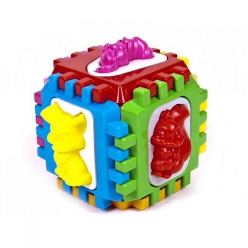 Логічний куб-сортер, з вкладишами. Куб зроблений з шести стінок, які збираються за принципом пазлів. На стінках куба отвори під фігурки тварин. Завдання дитини підібрати відповідність отворів і формочок.