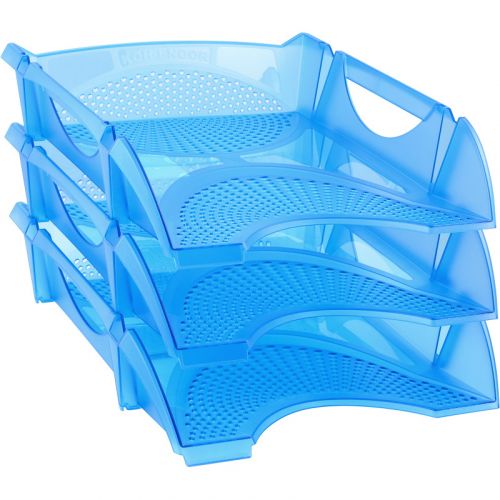 Горизонтальний лоток для документів виконаний з високоякісного первинного пластику. Кожен лоток витримує навантаження 2,5 кг, або 500 аркушів паперу щільністю 80 г/м2. Лотки компактно складаються один в один, за рахунок цього їх зручно зберігати і транспортувати. Стильний дизайн корпусу виконаний у прозоро-синьому кольорі.