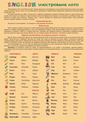 Лото “ENGLISH”. У коробці набір з 36 карток з поширеними англійськими словами за трьома тематичними групами: овочі, фрукти і тварини. Також в комплекті 12 планшеток по 6 малюнків на кожній, на звороті якої, прописані англійські слова по кожній ілюстрації.