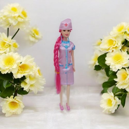 Гарна шарнірна лялька у вбранні медсестри. У комплекті є шапочка та стетоскоп. У ляльки гарна довга коса, волосся мʼяке і приємне на дотик. Висота ляльки: 30 см. Виконана з якісних та міцних матеріалів.