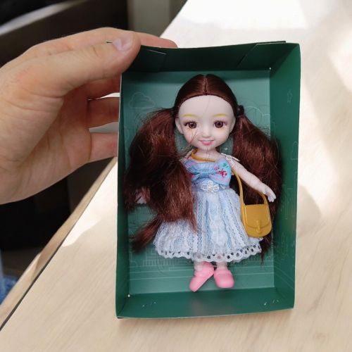 Мила шарнірна лялечка з довгим волоссям. Одягнена в гарне плаття, також у наборі є симпатична пластикова сумочка. Руки та ноги рухливі у суглобах. Лялечка невеликого розміру, висота – 15 см. Виконана з якісних та безпечних матеріалів. Для дітей віком від 3-х років.