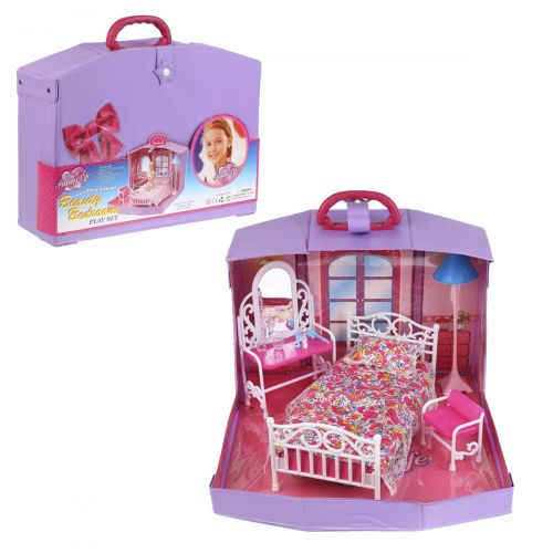 Милий набір лялькових меблів у валізі, з якого можна зібрати затишну спальню. У наборі є: ліжко з гарною постільною білизною, торшер, стільчик та трюмо. Лялька набір не включена.
