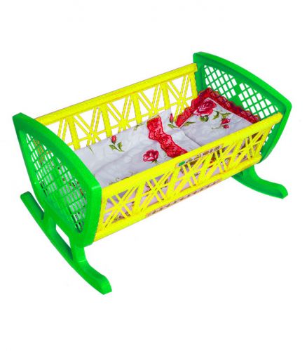 Складна дитяча пластикова ліжечко. Складається з 5 деталей. Також в комплекті йдуть простирадло (43 х 25), подушечка, наповнювач – синтепон (11 х 17), ковдру, наповнювач – синтепон (44 х 21). Матеріал – текстиль, нейлонове мереживо. Набір упакований в щільний вініловий пакет.
