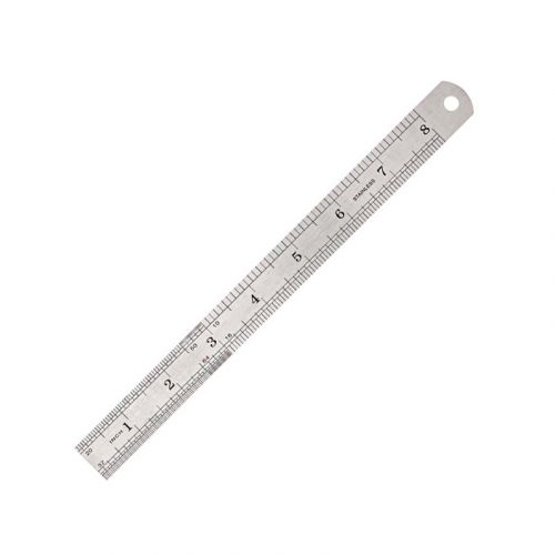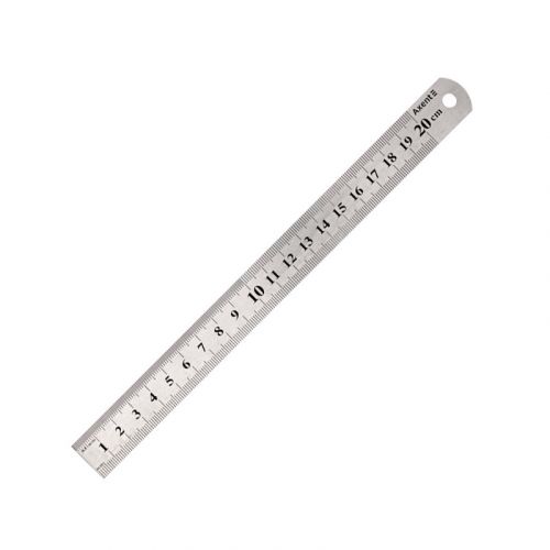 Двустороння лінійка 20 см, виготовлена із нержавіючої сталі, стійка до деформації. На одній стороні лінійки знаходиться 2 сантиметрові шкали, на іншій – 2 дюймові. Лінійка знаходиться в PVC чохлі.