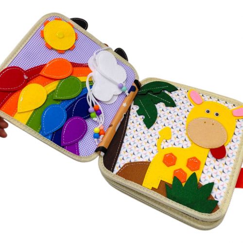 Малюки просто обожнюють щось крутити, застібати, відкривати й перевертати, тому ця м’яка книжка-бізіборд неодмінно стане їхньою улюбленою розвагою! Вона не лише дарує задоволення від гри, а й допомагає розвивати важливі навички – уважність, логіку, пам’ять і дрібну моторику. У кожній сторінці заховані захопливі завдання: сортування, шнурівка, ігри з липучками та вправи для пальчиків. Просто ідеальна іграшка для пізнання світу через гру! Книжка виконана в яскравому дизайні із зображенням милого жирафа; Розмір складеної книжки: 21х7х21 см; Пальчикові ігри, шнурівка, тваринки, сортер за кольорами, елементи на липучках. Виконана з фетру. Розвиває дрібну моторику, логічне мислення та сенсорне сприйняття.