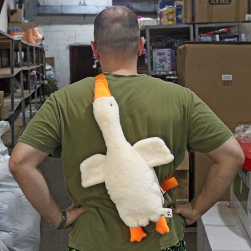 Мʼяка іграшка-сумка у вигляді гусака, створеного для обіймів. Виконана з якісних та безпечних матеріалів. Розмір іграшки – 55 см. Буде чудовим подарунком як дитині, так і дорослій. Іграшка-обіймашка може використовуватися як сумка, подушка або прикраса інтерʼєру. Виготовлено в Україні.