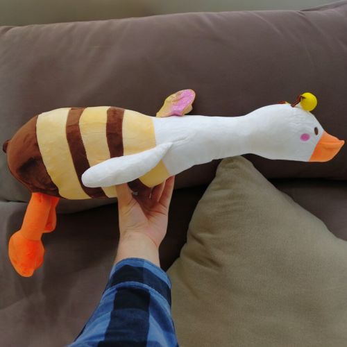Мʼяка іграшка “Гусь-обіймусь” у вигляді бджілки. Буде чудовим подарунком як дитині, так і дорослому. Іграшка-обіймашка може використовуватися як подушка або прикраса інтерʼєру. Може стати вірним супутником у різних ігрових сценаріях, фантазійних історіях чи просто милим обʼєктом для зворушливих моментів. Довжина – 65 см.