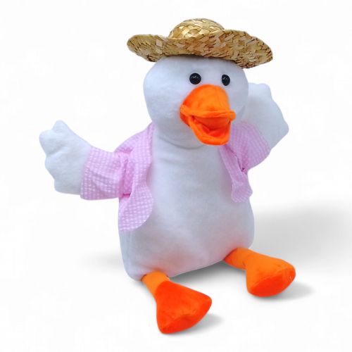 Мʼяка іграшка у вигляді милої качечки у яскравій сорочці та соломʼяному капелюсі стане чудовим подарунком для дітей та дорослих. Висота іграшки – 30 см. Якщо її потрясти, то вона видасть кумедний, характерний для качки, крякаючий звук, що додає їй особливого шарму.