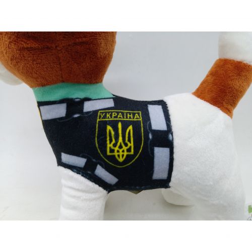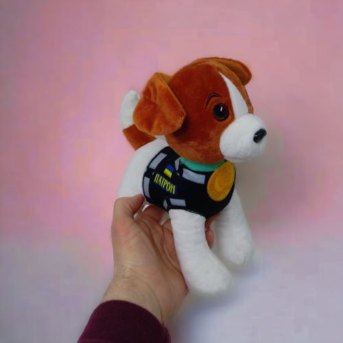 Мʼяка іграшка у вигляді песика-сапера Патрона. Така іграшка буде чудовим подарунком як дорослому, так і дитині. Виконана з якісних та приємних на дотик матеріалів, має надійні шви. Очі пластикові. Іграшка співає пісню про пса Патрона при натисканні на кнопку на животі. Розмір іграшки: 21х24х10 см.