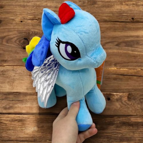 Чарівна мʼяка іграшка у вигляді поні-єдинорога, виконана у стилістиці популярного мультсеріалу “My little pony” (Моя маленька поні). Ріг та крильця виконані з красивої блискучої тканини. Іграшка дуже мʼяка і приємна на дотик, якісна та міцна. Розмір – 25х26х10 см.
