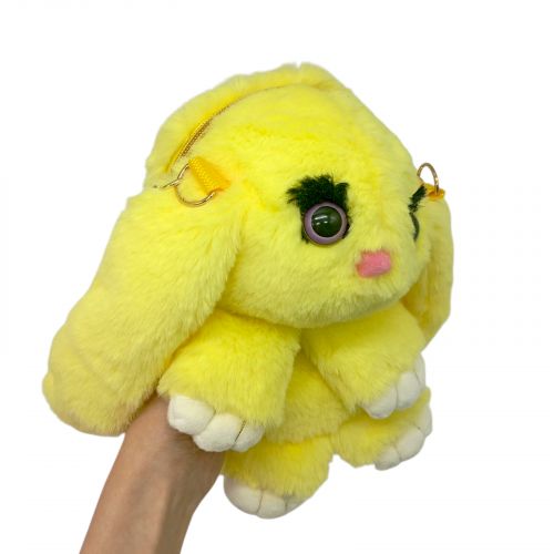 Милий дитячий рюкзак у вигляді кролика. Дуже мʼякий і приємний на дотик, виконаний з яскравої та пухнастої тканини. Оченята пластикові. Оснащений двома металевими лямками-ланцюжками на карабінах. Є одне відділення на блискавці, в яке можна покласти телефон, записник, ключі або інші невеликі аксесуари. Розмір рюкзака – 27х20х11 см.