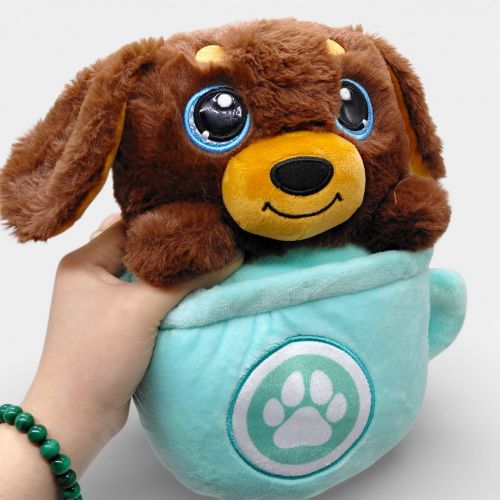 М’яка іграшка виконана у вигляді кумедної собачки, яка сидить у декоративній чашці з ручкою. Поєднання коричневого кольору песика та ніжного відтінку чашки створює привабливий вигляд.