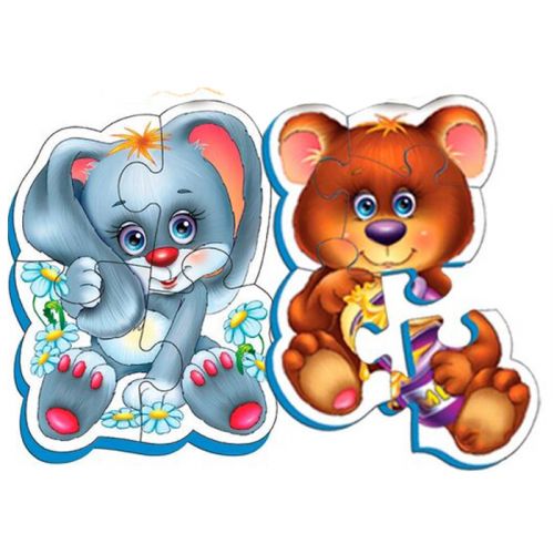 Мʼякі пазли для найменших. У комплекті: 2 пазли на 2 та на 4 елементи. Великі деталі ідеально підійдуть для дитячих ручок. Розмір готового зображення – приблизно 17 х 11 см. Пазли виготовлені з якісних та безпечних матеріалів. Для дітей віком від 3-х років.
