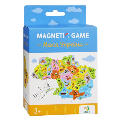 Магнітні пазли “Карта України”. Пазл складається з 28 елементів. Розмір однієї деталі: приблизно 5 см. На готовому зображенні ви зможете побачити карту України з яскравими та цікавими малюнками та назвами всіх областей. Карту можна розмістити на холодильнику чи магнітній дошці.