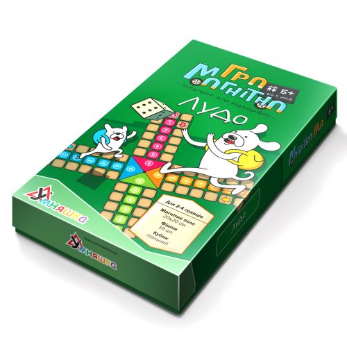 Настільна магнітна гра “Лудо”. Брати участь в грі можуть 2-4 гравця. Мета гри – “вивести” всі свої фішки в центр поля. Гравці ходять по черзі: кидають гральний кубик і роблять хід відповідно до цифрою, яка випала. Розмір ігрового поля – 20х20 см. Для дітей від 5 років.