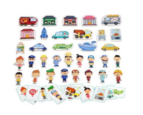 Набір допоможе дитині легко, в ігровій формі запам’ятовувати назви професій. Так само розвиває логічне мислення. У комплекті є магнітні форми (одяг, персонажі, а так само інші об’єкти, які відносяться до тієї чи іншої професії), дощечка для магнітних форм, маркер на водній основі, 5 кольорової крейди і ластик. Набір складається з 50 частин і 17 карток із зображеннями. Для дітей від 3 років.