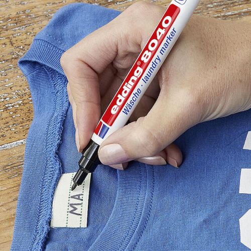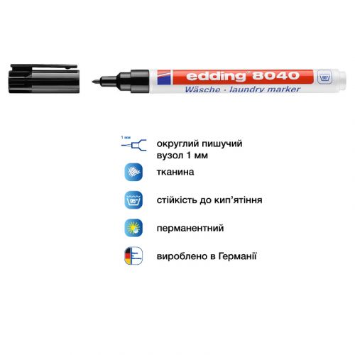 Універсальний маркер служить для нанесення написів, малюнків і маркування практично на будь-які текстильні матеріали, наприклад: бавовна, шовк, льон та інші. Спеціальне чорнило edding на пігментній основі добре лягає практично на будь-який тип тканини (як натуральної, так і синтетичної). При нанесенні не розмазується, не розтікається, швидко сохне. Після нанесення маркування стійке до багаторазового прання і кип’ятіння. Маркер e-8040 ідеально підходить для нанесення міток на дитячі речі, для використання в дитячих садках, яслах, школах, піонерських таборах. Також маркер застосовується для нанесення міток на текстильні вироби в лікарнях та інших установах. Ширина сліду 1 мм. Колір чорнила: чорний.