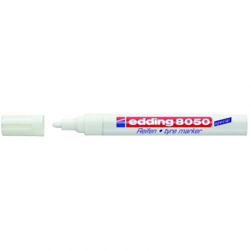 Універсальний маркер e-8050 служить для нанесення маркування практично на будь-які вироби з гуми. Чорнило містить спеціальні присадки, які дозволяють нанесеному маркуванню добре триматися на гумовій поверхні, не обсипатися. При нанесенні чорнило edding не розмазується, не розтікається, швидко сохне. Світлостійке чорнило маркера практично без запаху, еластичне. Після нанесення маркування стійке до механічного стирання. Маркер e-8050 ідеально підходить для нанесення маркування на автошини. Даний маркер рекомендується використовувати у спеціальних сезонних сховищах автошин і в автомайстернях. Ширина сліду 2-4 мм. Колір чорнила: білий. Інструкція з використання Кілька разів струсіть маркер з закритим ковпачком. Відкрийте ковпачок, поставте маркер пишучим наконечником на папір або іншу поверхню і злегка натискайте на пишучий наконечник – до тих пір, поки чорнило не заповнить наконечник маркера.