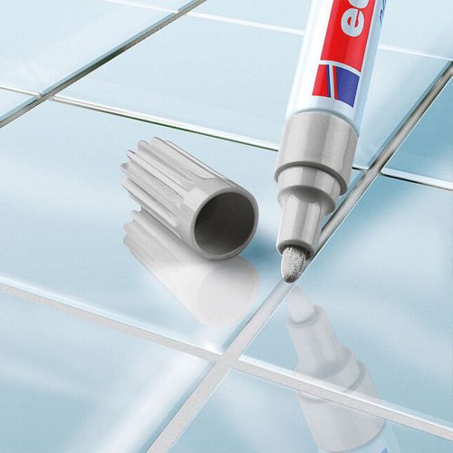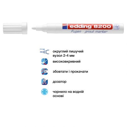 Маркер для зафарбовування, корекції і надання більш естетичного вигляду кахельним швам. Корпус виготовлений з поліпропілену. Чорнило непрозоре, не стирається, не змивається водою, майже без запаху. Маркер залишає густий рівний і щільний слід, який не розтікається на поверхні і швидко сохне. Після висихання слід чорнила не розтріскується і не обсипається. До складу чорнила входять спеціальні присадки і фунгіцид, що запобігає утворенню цвільового грибка і захищає від проникнення води. У комплект входять 3 запасних змінних наконечника. Форма пишучого вузла – кругла, ширина лінії 2-3мм. Колір чорнила: білий.