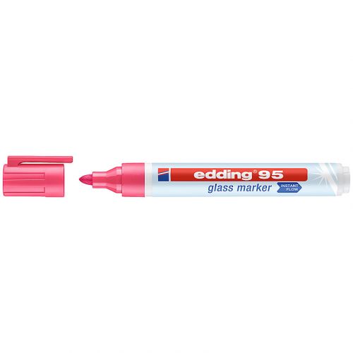 Маркер edding Glass e-95/09 підходить для нанесення написів і маркування на скляні поверхні, а також скляні та білі дошки. Стане чудовим інструментом для створення блискучих написів, малюнків і діаграм. Флуоресцентне чорнило практично без запаху, світлостійке та має непрозорий колір. Напис легко витирається сухою тканиною, не залишаючи слідів на поверхні. Округлий пишучий вузол. Ширина лінії: 1,5-3 мм. Колір чорнила: рожевий.