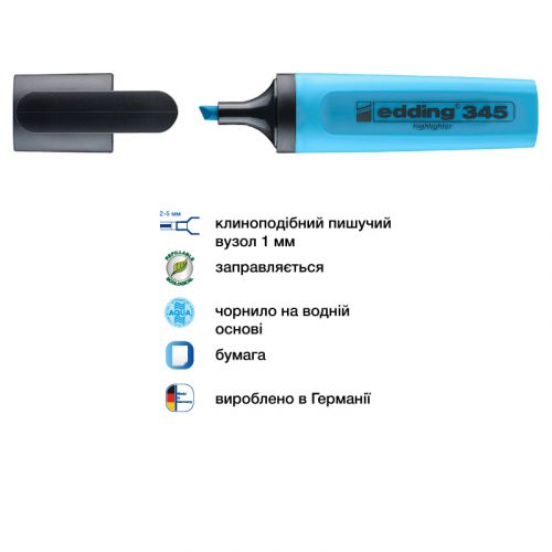 Залишає чіткий, яскравий, насичений слід. Підходить для всіх видів паперу. Чорнило на водній основі. Слід не передається по факсу, не просочується крізь папір. Не розмазує текст, роздрукований на струменевому принтері або написаний чорнилом. Клиноподібний пишучий вузол. Ширина сліду 2-5 мм. Колір чорнила: блакитний.