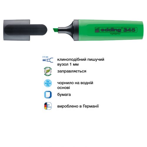 Залишає чіткий, яскравий, насичений слід. Підходить для всіх видів паперу. Чорнило на водній основі. Слід не передається по факсу, не просочується крізь папір. Не розмазує текст, роздрукований на струменевому принтері або написаний чорнилом. Клиноподібний пишучий вузол. Ширина сліду 2-5 мм. Колір чорнила: зелений.