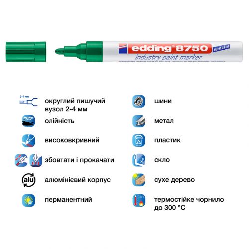 Застосовується для письма на жирних, вкритих пилом, брудних поверхнях. Стійкий до кислот, розчинників, механічного стирання. Чорнило маркера e-8750 містить високу концентрацію пігменту, що дозволяє йому добре лягати на гладкі і шорсткі поверхні. Спеціальні добавки, введені до складу маркера e-8750, розчиняють масляну плівку на поверхні письма. Непрозоре лакове чорнило дозволяє робити добре помітні написи густим щільним шаром навіть на темних поверхнях. Маркер e-8750 добре зарекомендував себе в роботі при перепадах температур від -30°С до +30°С. Маркер e-8750 також може використовуватися як універсальний, наприклад, при нанесенні позначок на різнорідні матеріали. При маркуванні виробів з гуми, пластику, металу, скла, спецодягу немає необхідності використовувати різні маркери, можна обійтися одним – e-8750. Ширина сліду 2-4 мм. Колір чорнила: зелений. Інструкція з використання 1. Кілька разів струсіть маркер з закритим ковпачком. 2. Відкрийте ковпачок, поставте маркер пишучим наконечником на папір або іншу пове