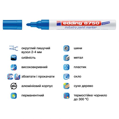 Застосовується для письма на жирних, вкритих пилом, брудних поверхнях. Стійкий до кислот, розчинників, механічного стирання. Чорнило маркера e-8750 містить високу концентрацію пігменту, що дозволяє йому добре лягати на гладкі і шорсткі поверхні. Спеціальні добавки, введені до складу маркера e-8750, розчиняють масляну плівку на поверхні письма. Непрозоре лакове чорнило дозволяє робити добре помітні написи густим щільним шаром навіть на темних поверхнях. Маркер e-8750 добре зарекомендував себе в роботі при перепадах температур від -30°С до +300°С. Маркер e-8750 також може використовуватися як універсальний, наприклад, при нанесенні позначок на різнорідні матеріали. При маркуванні виробів з гуми, пластику, металу, скла, спецодягу немає необхідності використовувати різні маркери, можна обійтися одним – e-8750. Ширина сліду 2-4 мм. Колір чорнила: синій.