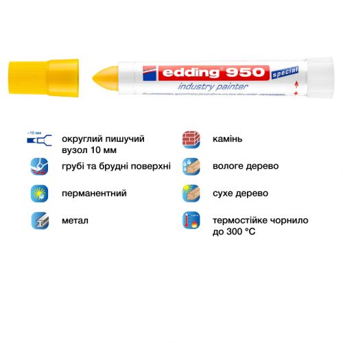 Перманентний маркер з високостійкою пігментною пастою, яка лягає щільним шаром. Ідеальний для написання на шорстких та іржавих металевих поверхнях, а також забруднених матеріалах. Слід маркера не стирається, світло- і водостійкий, стійкий до температури до 300°С. Ширина сліду 10 мм. Колір пасти: жовтий.