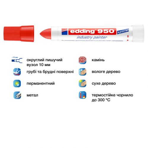 Перманентний маркер з високостійкою пігментною пастою, яка лягає щільним шаром. Ідеальний для написання на шорстких та іржавих металевих поверхнях, а також забруднених матеріалах. Слід маркера не стирається, світло- і водостійкий, стійкий до температури до 300°С. Ширина сліду 10 мм. Колір пасти: червоний.