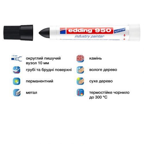 Перманентний маркер з високостійкою пігментною пастою, яка лягає щільним шаром. Ідеальний для написання на шорстких та іржавих металевих поверхнях, а також забруднених матеріалах. Слід маркера не стирається, світло- і водостійкий, стійкий до температури до 300°С. Ширина сліду 10 мм. Колір пасти: чорний.