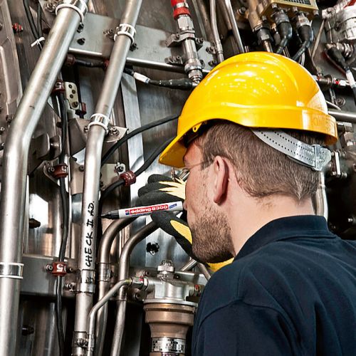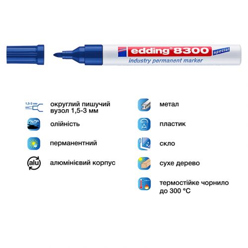 Спеціальний промисловий маркер для написання на забруднених, вкритих пилом і жирних поверхнях. На відміну від звичайного перманентного маркера е-8300 має зміцнений, стійкий до стирання круглий пишучий вузол. Чорнило має більш високу концентрацію пігменту і спеціальні добавки, що розчиняють масляну плівку. Слід чорнила стійкий до кислот, розчинників і тертя. Перманентні стійкі чорнила. Пишучий вузол – круглий, ширина лінії 1,5-3 мм. Колір чорнила: синій.
