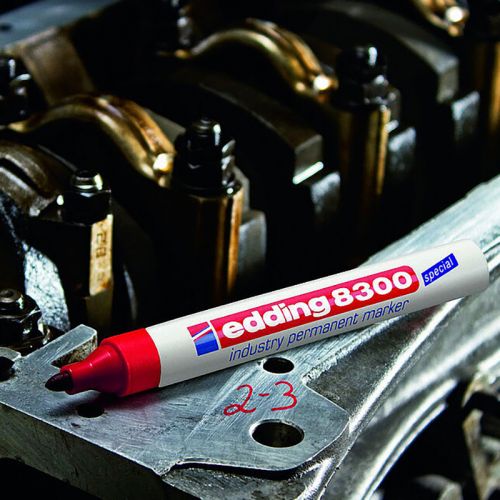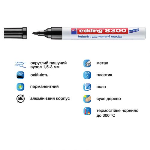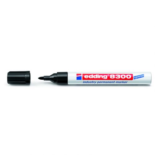 Спеціальний промисловий маркер для написання на забруднених, вкритих пилом і жирних поверхнях. На відміну від звичайного перманентного маркера е-8300 має зміцнений, стійкий до стирання круглий пишучий вузол. Чорнило має більш високу концентрацію пігменту і спеціальні добавки, що розчиняють масляну плівку. Слід чорнила стійкий до кислот, розчинників і тертя. Перманентні стійкі чорнила. Пишучий вузол – круглий, ширина лінії 1,5-3 мм. Колір чорнила: чорний.