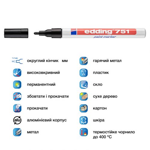 Маркер edding Paint e-751/01 підходить для нанесення перманентного маркування на будь-які поверхні, навіть на темні та прозорі матеріали (метал, скло та пластик). Має лакове термостійке чорнило до 400°C. Водостійке, швидко сохне та вирізняється світлостійкістю, зносостійкістю. Чорнило не містить толуолу та ксилолу і практично не має запаху. Ширина лінії: 1-2 мм. Колір чорнила: чорний.