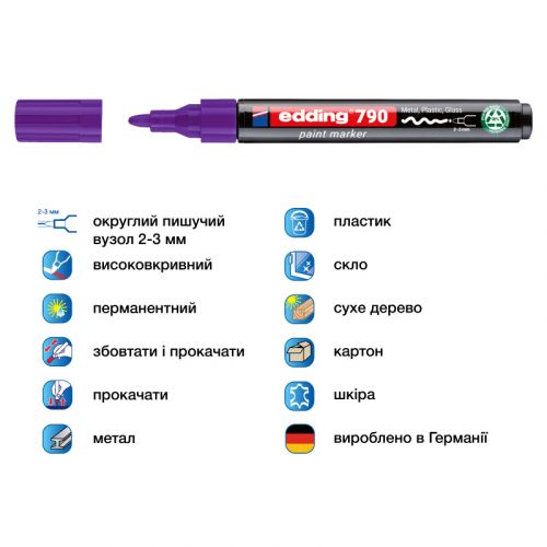Лаковий маркер edding 790 забезпечує чітке, стійке маркування навіть на темних поверхнях. Завдяки густим чорнилам з високою покривною здатністю та округлому наконечнику (2–3 мм), він підходить для точного нанесення. Пише на таких матеріалах, як: метал, пластик, скло, суха деревина, картон, шкіра, лаковані поверхні. Маркер забезпечує довговічне та помітне покриття при використанні як в приміщеннях, так і на вулиці. Слід маркеру є волого-, зносо- , світло- та термостійким. Завдяки якісним чорнилам на спиртовій основі, слід маркеру швидко висихає та не розмазується. Ідеальний для виробництв, майстернь та побутових задач. Чорнила практично не мають запаху, не містять толуолу та ксилолу Виготовлений в Німеччині.