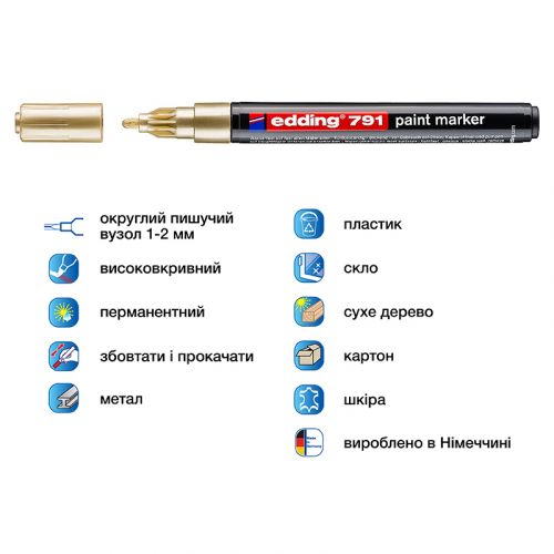 Використовуються для нанесення промислового маркування практично на всіх матеріалах. Залишають густий непрозорий слід, що нагадує слід фарби або лаку. Чорнило містить високу концентрацію пігменту, що дозволяє йому добре лягати на гладкі та шорсткі поверхні. Слід маркера термостійкий, має високі показники зносостійкості. Чорнило не містить толуолу і ксилолу – небезпечних для здоров’я речовин. Застосовуються для декоративних робіт. Тонкий круглий пишучий вузол. Ширина сліду 1-2 мм. Колір чорнила: золотий. Інструкція з використання: 1. Кілька разів струсіть маркер з закритим ковпачком. 2. Відкрийте ковпачок, поставте маркер пишучим наконечником на папір або іншу поверхню і злегка натискайте на пишучий наконечник – до тих пір, поки чорнило не заповнить наконечник маркера.
