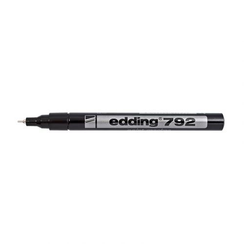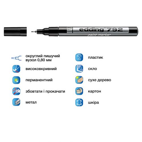 Використовуються для нанесення промислового маркування практично на всіх матеріалах. Залишають густий непрозорий слід, що нагадує слід фарби або лаку. Чорнило містить високу концентрацію пігменту, що дозволяє йому добре лягати на гладкі та шорсткі поверхні. Слід маркера термостійкий, має високі показники зносостійкості. Чорнило не містить толуолу і ксилолу – небезпечних для здоров’я речовин. Застосовуються для декоративних робіт. Дуже тонкий пишучий вузол у металевій оправі. Ширина сліду 0,8 мм. Колір чорнила: чорний. Інструкція з використання: 1. Кілька разів струсіть маркер з закритим ковпачком. 2. Відкрийте ковпачок, поставте маркер пишучим наконечником на папір або іншу поверхню і злегка натискайте на пишучий наконечник – до тих пір, поки чорнило не заповнить наконечник маркера.