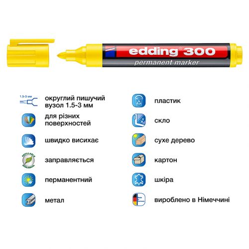 Універсальний перманентний маркер! Для нанесення стійких написів практично на будь-якій поверхні: метал, дерево, скло, картон, пластик, кераміка і т.д. Підвищена світлостійкість. Напис стійкий до впливу вологи, стирання, атмосферних впливів. Спеціальний склад чорнила edding на спиртовій основі при зберіганні не роз’їдає поверхню, на яку нанесений. Пишучий вузол виготовлений так, що при письмі не вимагає сильного натискання на маркер. Чорнило практично без запаху. Круглий пишучий вузол. Ширина сліду 1,5-3 мм. Колір чорнила: жовтий.