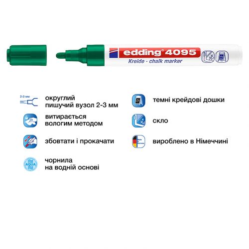 Маркери для вікон і гладких поверхонь. Чорнило на основі розведеної крейди, містить високу концентрацію крейдяних частинок, що дозволяє йому добре лягати на поверхню, залишаючи густу, щільну лінію. Стирається з гладких поверхонь сухою губкою, з шорстких видаляється водою. Без запаху, не токсичне. Корпус з міцного пластику. Стійкий до стирання пишучий вузол. Круглий пишучий вузол, ширина лінії 2-3 мм. Світлостійке чорнило. Колір чорнила: зелений. Інструкція по використанню 1. Кілька разів струсіть маркер з закритим ковпачком. 2. Відкрийте ковпачок, поставте маркер пишучим наконечником на папір або іншу поверхню і злегка натискайте на пишучий наконечник – до тих пір, поки чорнило не заповнить наконечник маркера.