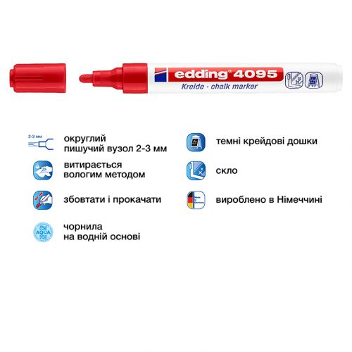 Маркери для вікон і гладких поверхонь. Чорнило на основі розведеної крейди, містить високу концентрацію крейдяних частинок, що дозволяє йому добре лягати на поверхню, залишаючи густу, щільну лінію. Стирається з гладких поверхонь сухою губкою, з шорстких видаляється водою. Без запаху, не токсичне. Корпус з міцного пластику. Стійкий до стирання пишучий вузол. Круглий пишучий вузол, ширина лінії 2-3 мм. Світлостійке чорнило. Колір чорнила: червоний. Інструкція по використанню 1. Кілька разів струсіть маркер з закритим ковпачком. 2. Відкрийте ковпачок, поставте маркер пишучим наконечником на папір або іншу поверхню і злегка натискайте на пишучий наконечник – до тих пір, поки чорнило не заповнить наконечник маркера.