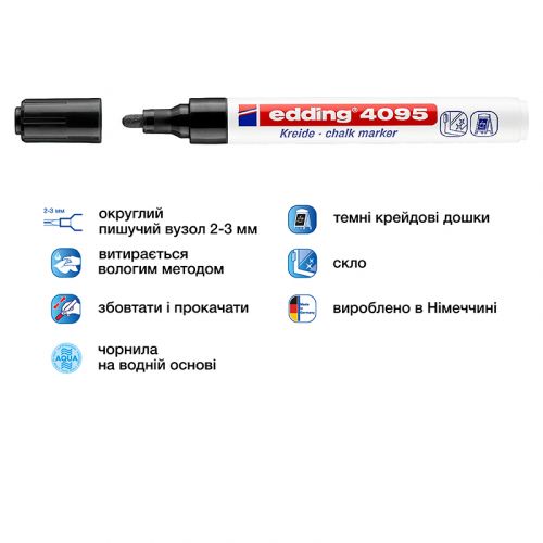 Маркери для вікон і гладких поверхонь. Чорнило на основі розведеної крейди, містить високу концентрацію крейдяних частинок, що дозволяє йому добре лягати на поверхню, залишаючи густу, щільну лінію. Стирається з гладких поверхонь сухою губкою, з шорстких видаляється водою. Без запаху, не токсичне. Корпус з міцного пластику. Стійкий до стирання пишучий вузол. Круглий пишучий вузол, ширина лінії 2-3 мм. Світлостійке чорнило. Колір чорнила: чорний. Інструкція по використанню 1. Кілька разів струсіть маркер з закритим ковпачком. 2. Відкрийте ковпачок, поставте маркер пишучим наконечником на папір або іншу поверхню і злегка натискайте на пишучий наконечник – до тих пір, поки чорнило не заповнить наконечник маркера.