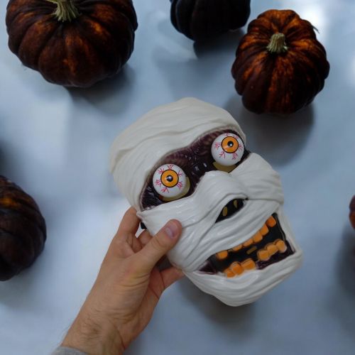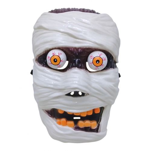 Пластикова маска у вигляді моторошної мумії стане незамінним аксесуаром для Хелловіна. Її унікальна особливість – очі на пружинках, які надають образу додаткового залякування. Підходить для дітей, які хочуть виділитися та налякати своїх друзів на святковій вечірці. Розмір – 26 см.