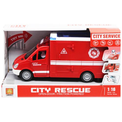 Інерційна машинка “Defender” добре деталізована та виконана з міцних та безпечних матеріалів. Є світлові та звукові ефекти – світяться мигалки, видає звуки їзди та сирен. Передні двері та багажник відчиняються, всередині є лікарняна каталка. Розмір машинки: 28з9х12.5 см.