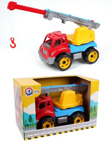 Яскрава пластикова машинка з підйомним краном і великими колесами. Має рухливу платформу. Кран може висуватися до 50 см, до кінця мотузки прикріплений великий гак. Виготовлений з міцного пластику.