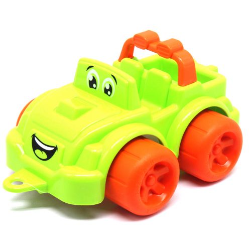 Яскрава пластикова машинка із зображенням забавного личка. Має петельку для мотузочки.