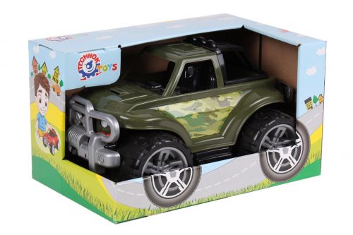 Потужний військовий джип з величезними колесами і бампером. Виготовлений з міцного пластику, має камуфляжний забарвлення. У машині одне пасажирське місце, одне місце водія і відкритий багажник.