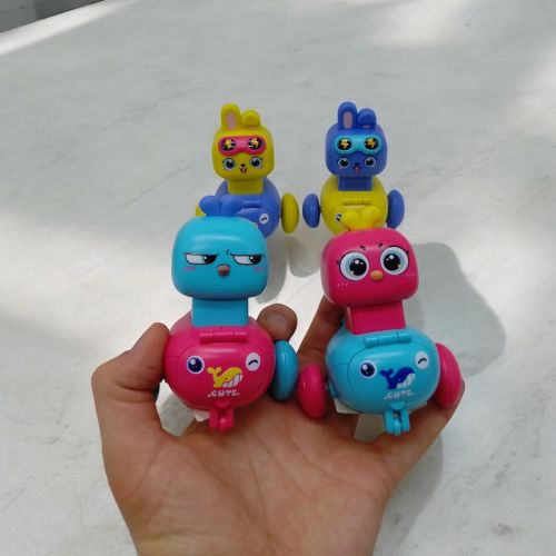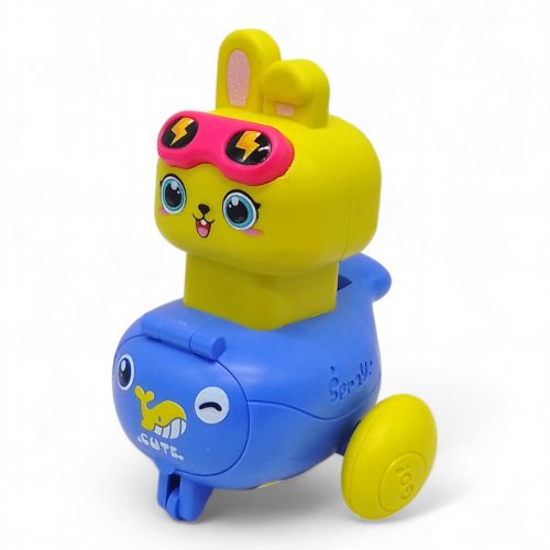 Яскрава заводна машинка із кумедним звірятком усередині – курчам або зайчиком. Просто натисніть на голову іграшки та відпустіть, і вона стрімко помчить уперед! У машинки є невеликий багажник спереду, а ззаду розташований свисток, який додає веселощів у гру. Розмір – 7,5 см.