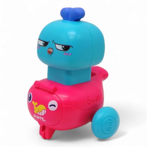 Яскрава заводна машинка із кумедним звірятком усередині – курчам або зайчиком. Просто натисніть на голову іграшки та відпустіть, і вона стрімко помчить уперед! У машинки є невеликий багажник спереду, а ззаду розташований свисток, який додає веселощів у гру. Розмір – 7,5 см.