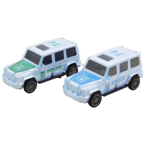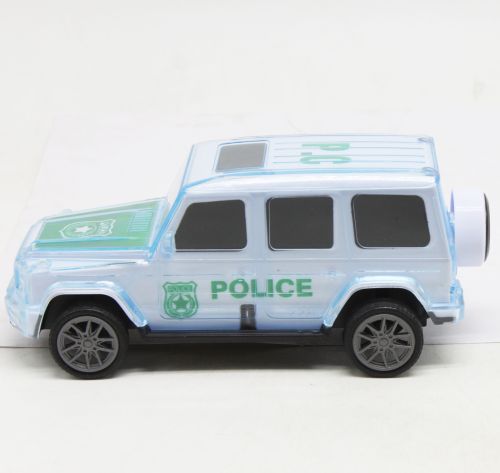 Інерційна поліцейська машинка зі світловими та звуковими ефектами. Має прозорий пластиковий корпус, завдяки якому підсвічування виглядає ще ефектніше. Видає звук поліцейської сирени. Розмір машини: 15х6 см. Три кольори в асортименті.